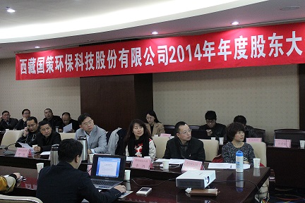 西藏國策環(huán)保科技股份有限公司2014年度年度股東大會(huì)在成都召開,董事會(huì)秘書楊偉強(qiáng)主持會(huì)議。董事長兼總經(jīng)理陳鴻、副董事長范津濤、副總經(jīng)理幸川、財(cái)務(wù)總監(jiān)趙永花、證券部經(jīng)理張麗等公司董事及核心成員出席本次會(huì)議。