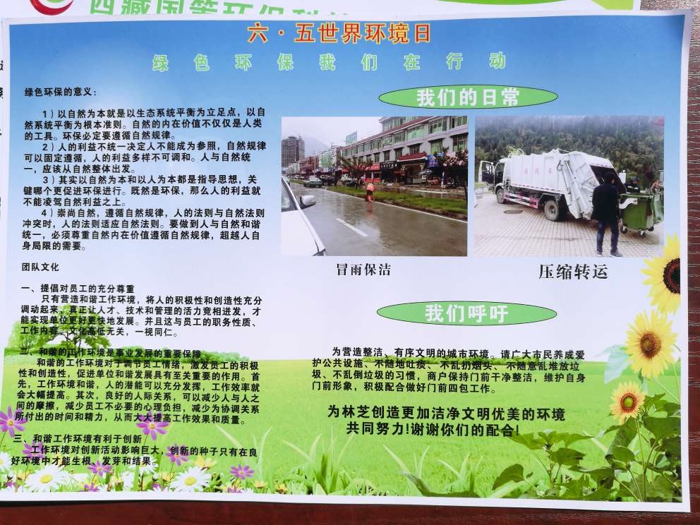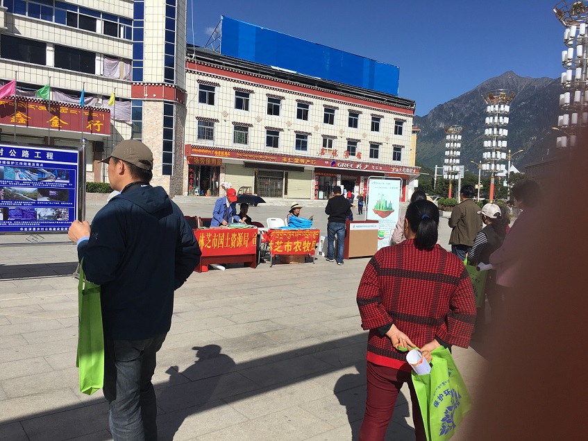 2017年6月5日,在林芝市巴宜區(qū)廈門廣場開展《六五世界環(huán)境日》環(huán)保宣傳活動,——“青山綠水便是金山銀山”,呼吁廣大市民、游客等廣大群眾參與保護雪域高原最后的碧水藍天;此次活動由林芝市環(huán)保局牽頭組織舉辦,參與活動單位:林芝市市政管理局、西藏國策環(huán)??萍脊煞萦邢薰玖种シ止?、林芝市農牧局、林芝市國土資源局、林芝市發(fā)改委、中國華能、巴宜區(qū)環(huán)保局、林芝市商務局、林芝市科技局、林芝市林業(yè)局等單位?;顒蝇F場也聚集市民、游客等參與環(huán)保宣傳和學習環(huán)保知識。