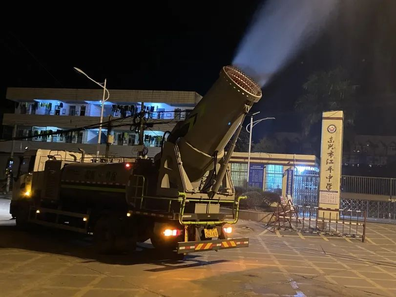 裝載完成后,車隊長曾慶彪開著裝滿消毒液的霧炮車對重點疫區(qū)江平鎮(zhèn)各主次干道、人流密集場所、重要點位進行高炮霧化消毒,以增強街道消毒效果,最大限度減少病毒滋生蔓延,切實為市民提供一個安全、清潔的城市環(huán)境。